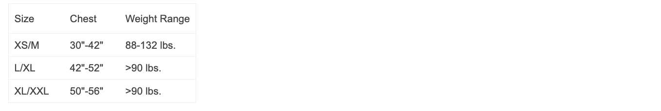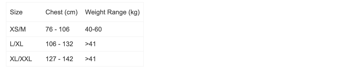 * The L/XL and XL/XXL sizes are rated for users weighing over 41 kg. Use the chest measurement ranges (including apparel layers) in the sizing chart for choosing your size.