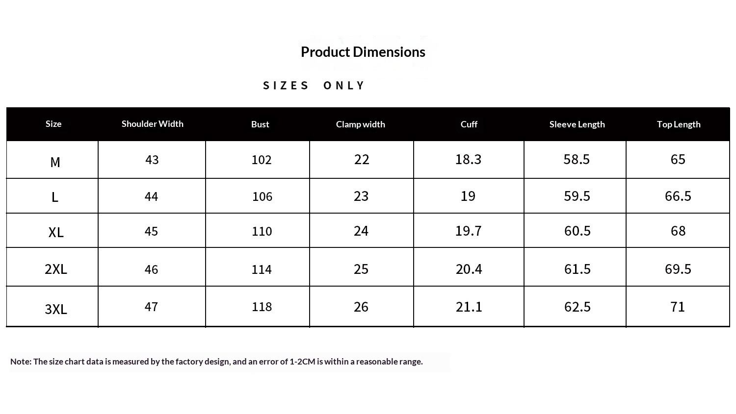 1. Asian sizes are 1 to 2 sizes smaller than European and American people. Choose the larger size if your size between two sizes. Please allow 2-3cm differences due to manual measurement. 2. Please check the size chart carefully before you buy the item, if you don't know how to choose size, please contact our customer service. 3.As you know, the different computers display colors differently, the color of the actual item may vary slightly from the following images.