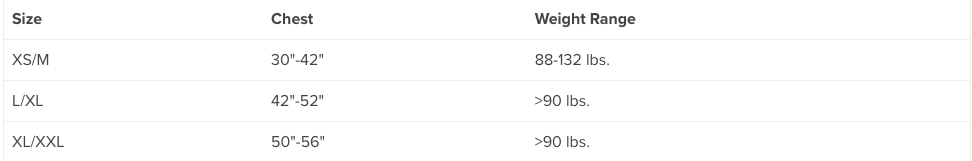 * The L/XL and XL/XXL sizes are rated for users weighing over 41 kg. Use the chest measurement ranges (including apparel layers) in the sizing chart for choosing your size.